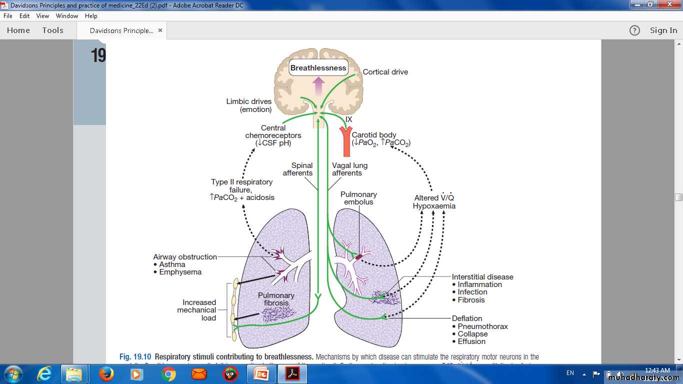 Respiratory stimuli contributing to breathlessness. Mechanisms by which disease can stimulate the respiratory motor neurons in themedulla. Breathlessness is usually felt in proportion to the sum of these stimuli. Further explanation is given on page 543. (V / Q = ventilation/perfusionmatch)
