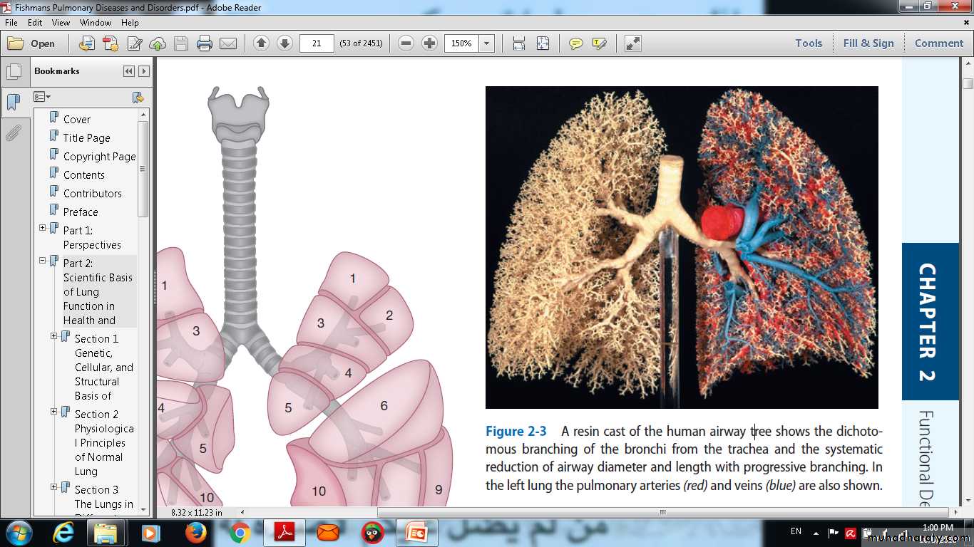 A resin cast of the human airway tree shows the dichotomousbranching of the bronchi from the trachea and the systematicreduction of airway diameter and length with progressive branching. Inthe left lung the pulmonary arteries (red) and veins (blue) .