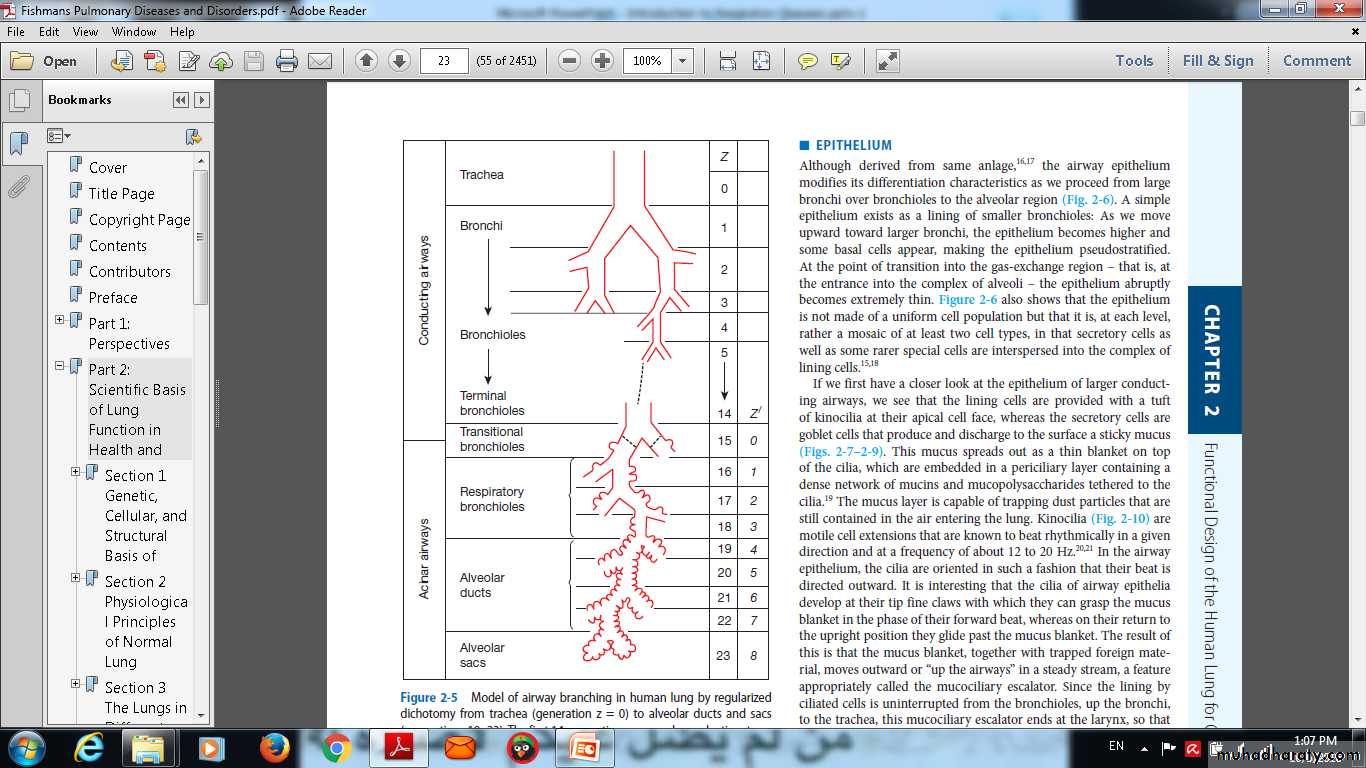 Model of airway branching in human lung by regularizeddichotomy from trachea (generation z = 0) to alveolar ducts and sacs(generations 19–23). The first 14 generations are purely conducting; transitionalairways (generation 15) lead into the acinar airways with alveolithat branch over 8 generations (z′).