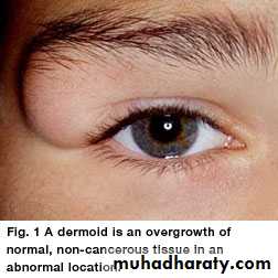 ; it’s a subcutaneous cyst caused by developmental inclusion of epidermis along lines of fusion. Its lined by stratified sequamous epithelium but unlike epidermoid cyst the wall contains functioning (not keratenizing) epidermal appendages such as hair follicles sweet and sebaceous gland.Site ; more commonly found on the lateral and medial end of eye brow(external and internal angular dermoid), midline of the nose (nasal dermoid), midline of the neck.