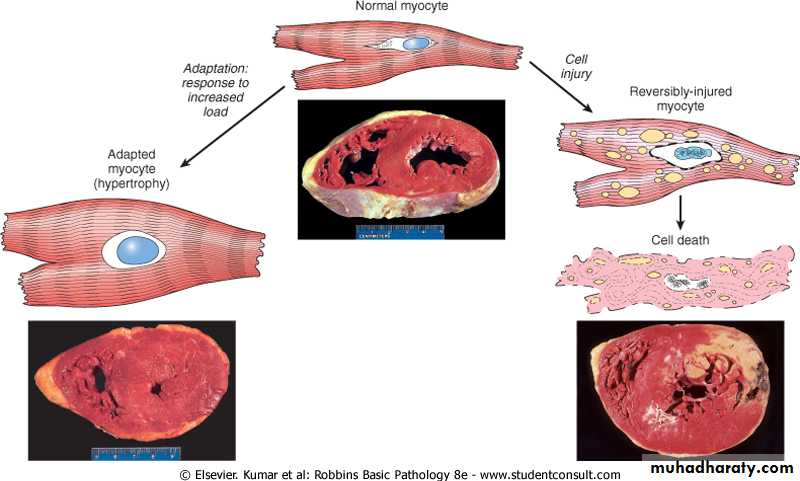 The above mentioned possibility can be exemplified by the responses of the heart to different types of stress. A myocardium that is subjected to persistently increased pressure load , as in hypertension, adapts by undergoing hypertrophy as increase in the size of individual cells and ultimately the entire heart to generate the required higher contractile force. If the increased demand is not relieved; the muscle cell may undergo injury. The injury may be reversible if the hypertension is mild; otherwise irreversible injury ( cell death) occurs.
