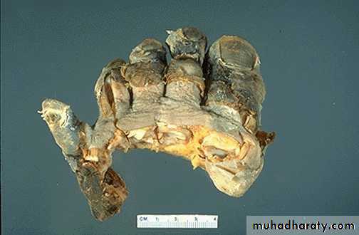 • the squamous changes that occur in the respiratory epithelium in habitual cigarette smokers. The normal ciliated columnar epithelial cells of the trachea and bronchi are focally or widely replaced by stratified squamous epithelial cells. Although the metaplastic squamous epithelium has survival advantages but important protective mechanisms are lost, such as mucus secretion and ciliary clearance of particular matter. Moreover the influences that induce metaplastic transformation; if persistent, may predispose to malignant transformation of the epithelium. In fact squamous cell carcinoma of the bronchi often coexists with squamous metaplasia. It is thought that cigarette smoking initially causes sq. metaplasia and cancer arise later in some of these altered foci.