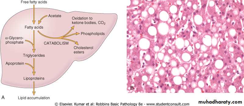 Alcohol abuse and diabetes associated with obesity are the most common cause of fatty change in the liver ( fatty liver) in industrialized nationsFree fatty acids from adipose tissue or ingested food are normally transported into hepatocytes, where they are esterified to triglycerides converted into cholesterol or phospholipids or oxidized to ketone bodies. Triglycerides from the hepatocytes required the formation of complexes with apoprotiens to form lipoproteins which are able to enter the circulation.
