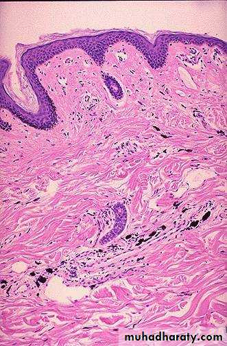 Melanin:- is an endogenous, brown-black pigment produced in melanocytes following the tyrosinase- catalyzed oxidation of tyrosine to dihydroxyphenylalanine. It is synthesized exclusively by melanocytes located in the epidermis and acts as a screen against harmful ultraviolet radiation. Although melanocytes are the only source of melanin, adjacent basal keratinocytes in the skin can accumulate the pigment (e.g. in freckles), as can dermal macrophages.