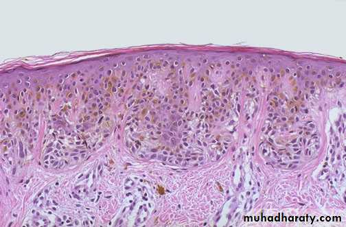 Above: these are benign nevi. Small brown flat to slightly raised nevi are quite common. They are usually less than a centimeter in diameter.Below: in this nevus, there are nevus cells in nests in the lower epidermis. They show brownish melanin pigment.