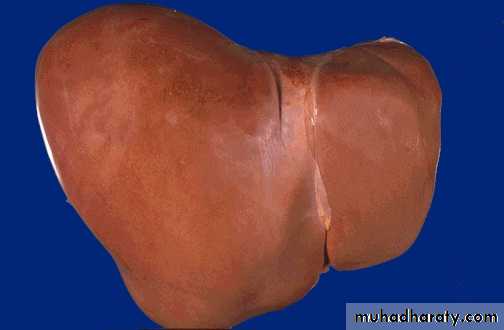 With increasing the accumulation, the organ enlarged and become progressively yellow, until in extreme cases it may weight 5 Kg (3 times the normal weight) and appear bright yellow, soft and greasy