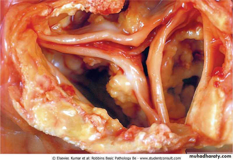 Aging or damaged heart valves resulting in severely impaired valve motion. Dystrophic calcification of the aortic valves is an important cause of aortic stenosis in the elderly.