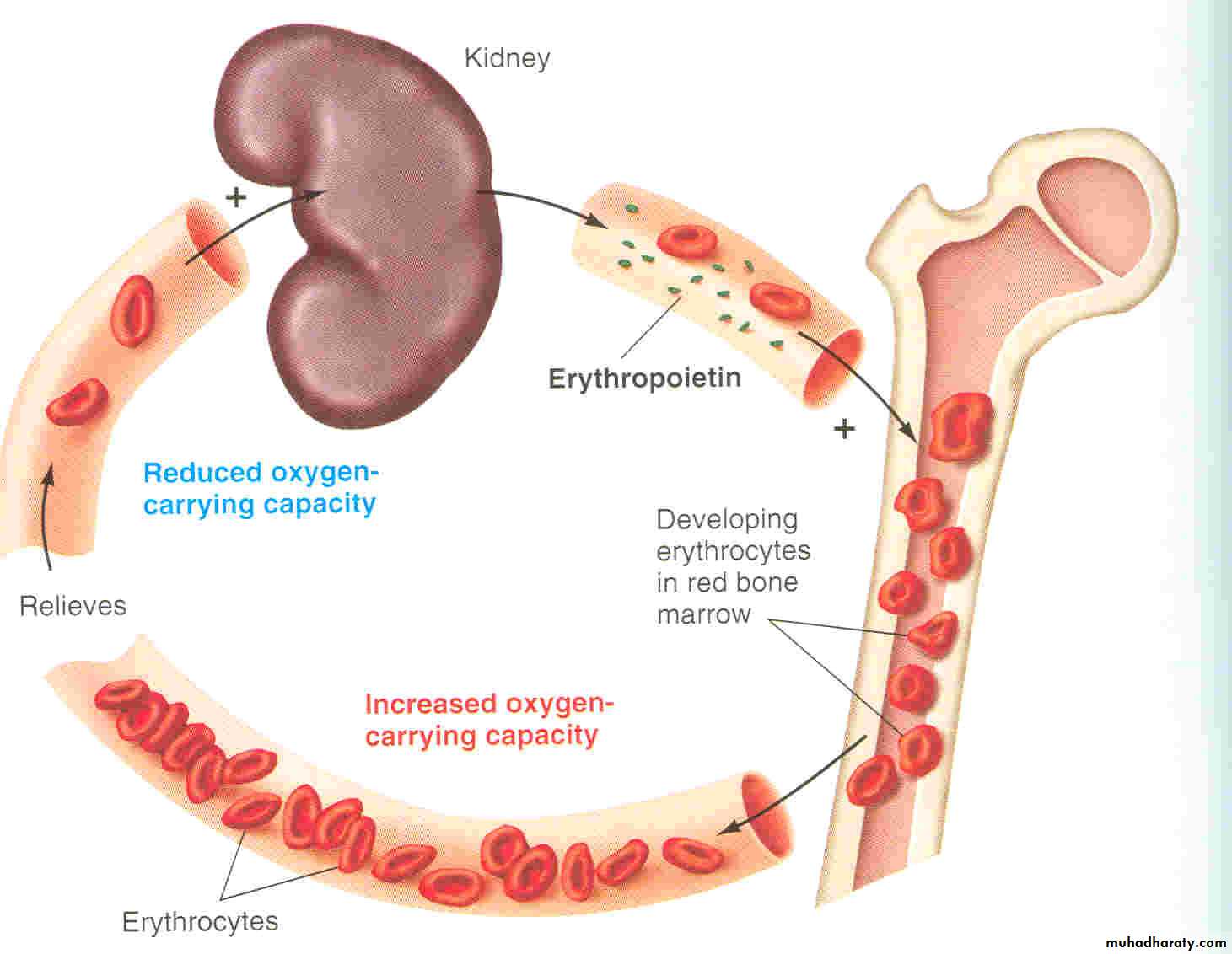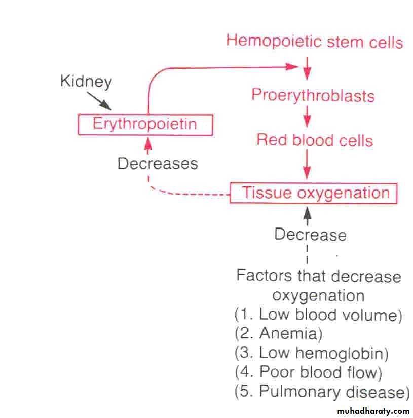 1- Erythropoiesis is stimulated by erythropoietin hormone produced by the kidney in response to hypoxia (low oxygen in the blood)