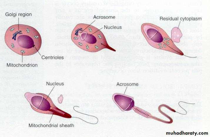 The series of changes resulting in the transformation of spermatids into spermatozoa is spermiogenesis. These changes include(1) formation of the acrosome, which covers half of the nuclear surface and contains enzymes to assist in penetration of the egg