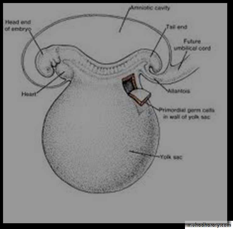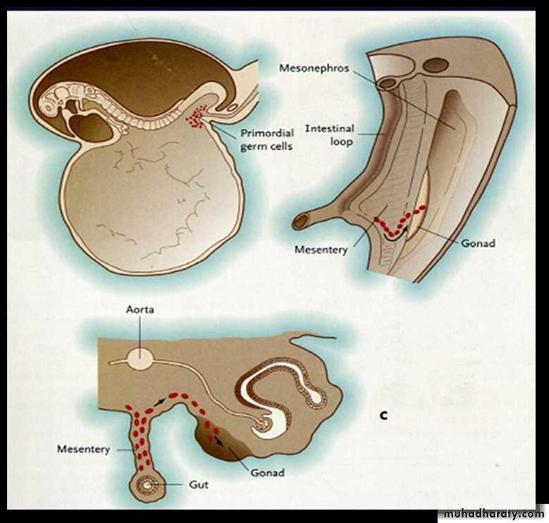 Gametes are derived from (PGCs) that are formed in epiblast during 2nd week & that move to wall of yolk sac.During 4th week, these cells begin to migrate by amoeboid movement from yolk sac toward developing gonads, where they arrive by end of 5th week