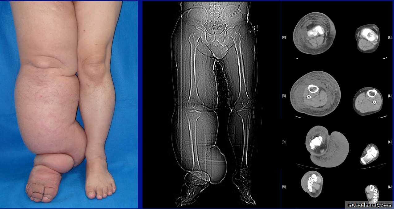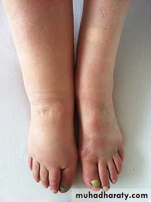 In the lower extremity, the swelling involves the dorsum of the foot, and the toes have a squared-off appearance.