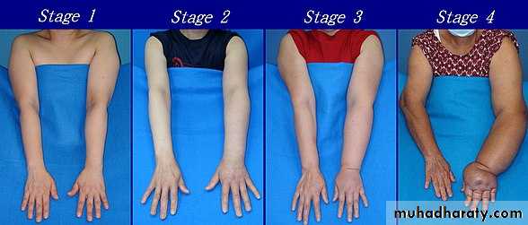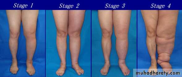 Later, the edema becomes nonpitting & limb elevation and compression with elastic garments then are much less successful at reducing the extremity volume.