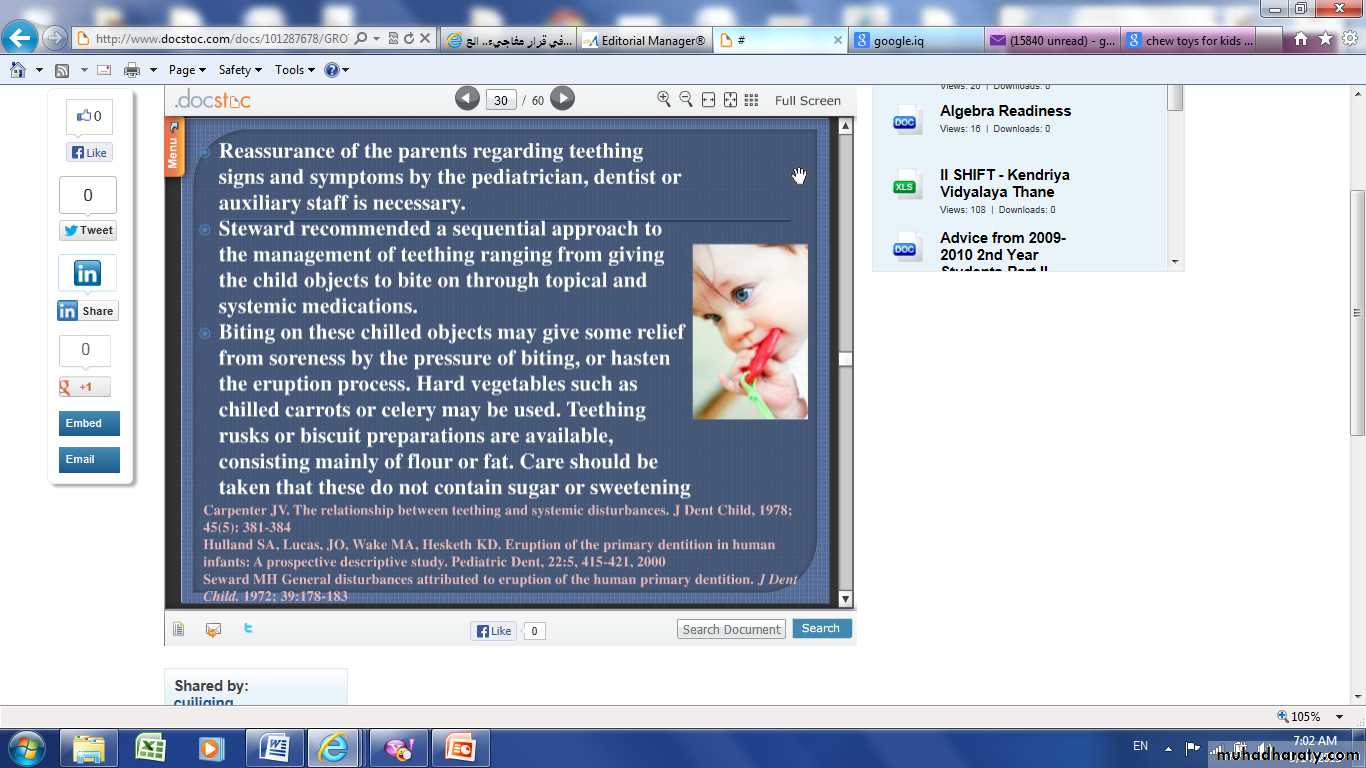 Eruption takes place over a period of two year.Reassurance of parents regarding teething signs and symptoms.