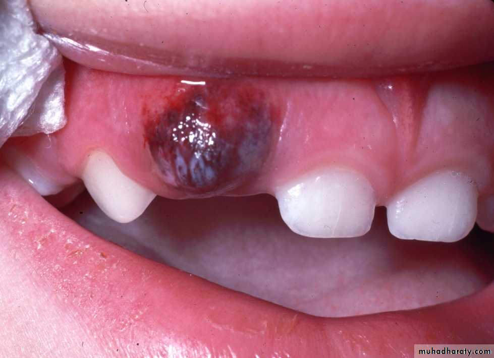 Bluish purple elevated areaResult from trauma to the area and a hemorrhage on follicle of erupted tooth.