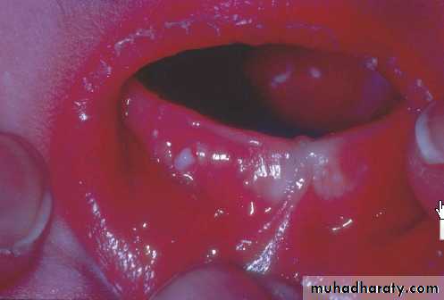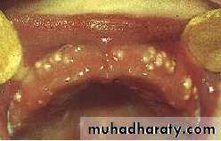 Small, white or grayish lesions on the alveolar mucosa of the newborn.