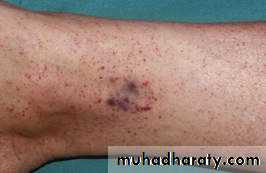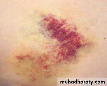 b) ecchymosis : larger extravasations of blood into the skin, as in many bleeding disorders.