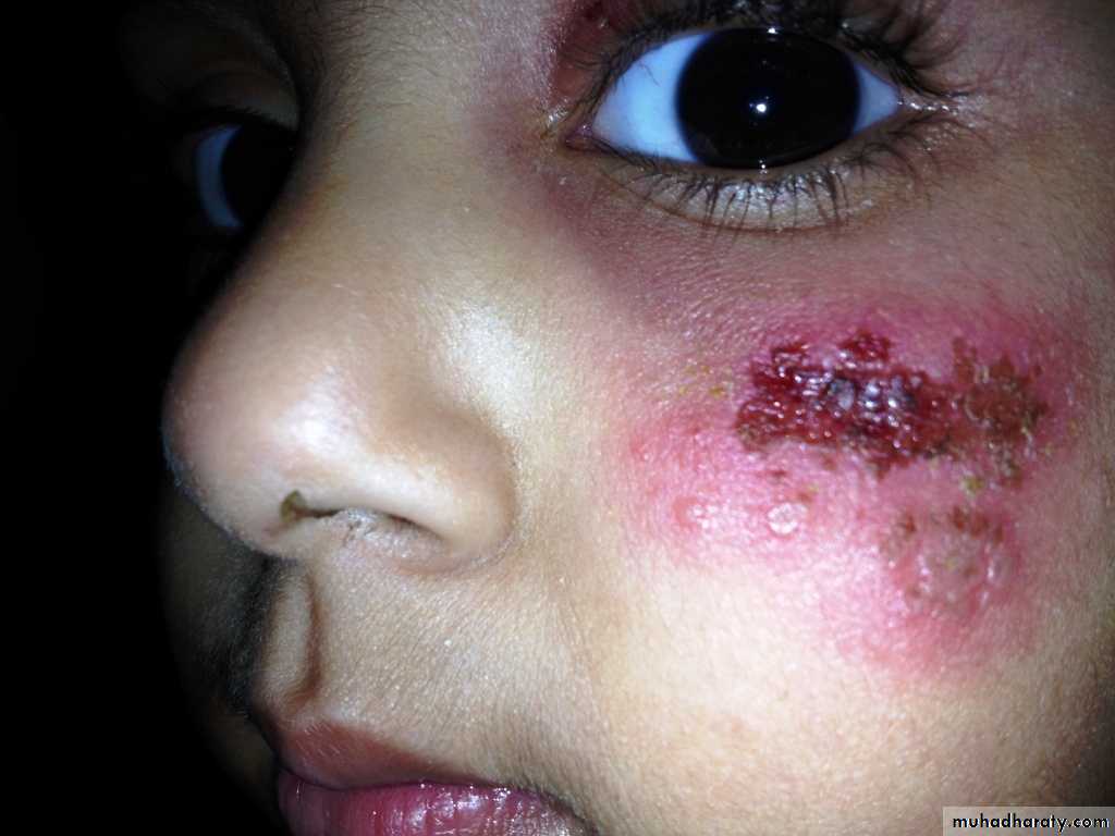 2) Crust: A collection of dried serum & cellular debris as in impetigo.