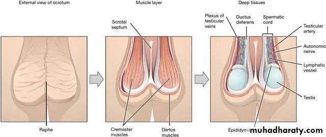 2 testis, epididymis & lower part of spermatic cordIts divided into Rt& Lt portions by median raphe,
