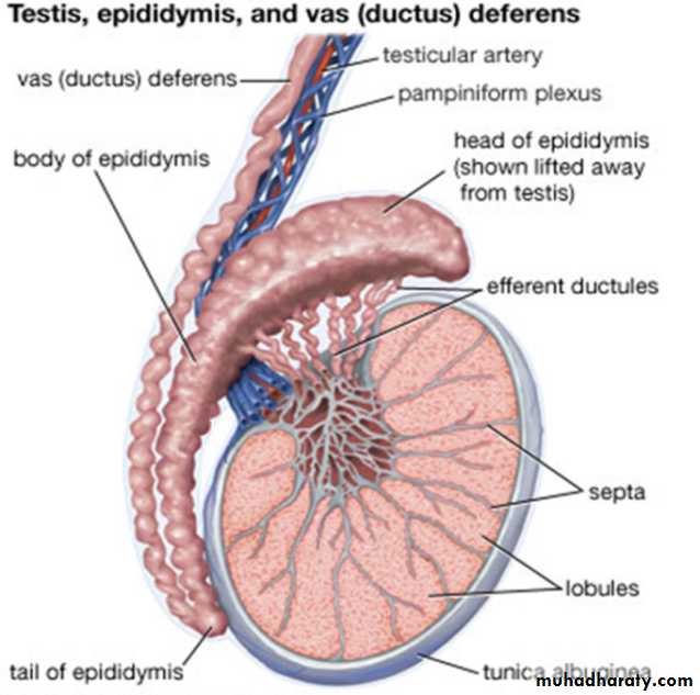 Each testis subdevided into several lobules by septa ,inside each lobule there is coiled tube known as seminiferous tubules ( its location of spermatogenesis, or formation of new sperm.) And, inside each tubule, there are sperm in all different stages of development,