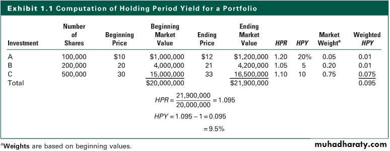 • A Portfolio of Investments• Portfolio HPY: The mean historical rate of return for a portfolio of investments is measured as the weighted average of the HPYs for the individual investments in the portfolio, or the overall change in the value of the original portfolio.
