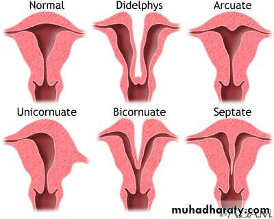 Septate uterus due to incomplete failure of fusion of two mullarian ducts may present with recurrent misscariage and malpresentatin during labor and management by removal of septumUterine didyphylus dut to complete failure of fusion of two mullarian ducts (pregnancy occur in one cavity)