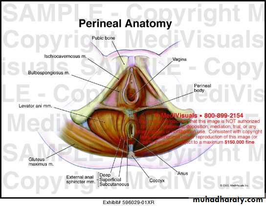 This is mass of muscular tissue that lies between the anal canal and the lower third of the vaginaIts apex is at the lower end of the rectovaginal septum at the point where the rectum and posterior vagineal walls come into contact. the base is covered with the skin and extend from the fourchette to the anus