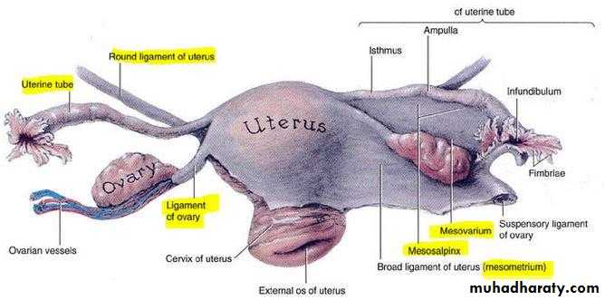 Each ovary is attached to the cornua of the uterus by ovarian ligment and at the hilum to the broad ligment by mesovarium which contains its supply of blood vessels and nerves