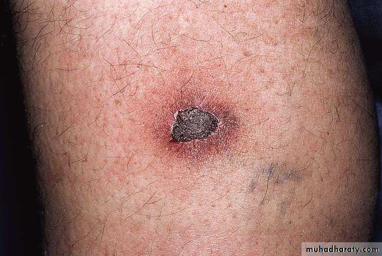 Present as adherent crusts, beneath which is a purulent irregular ulcer, & delayed healing with scarring.