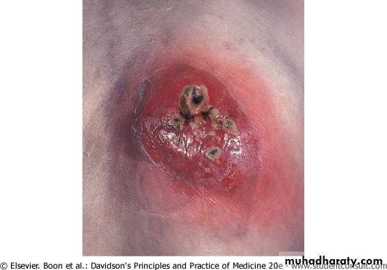Usually occur in areas of thick inelastic skin, the infection spreads to subcutaneous fat such as nape of neck, back & thighs