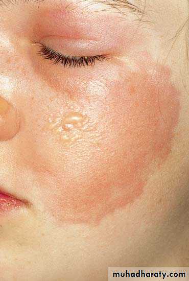 Erysipelas: infection of the dermis & upper part of subcutaneous tissue by group A ℬ heamolytic streptococci