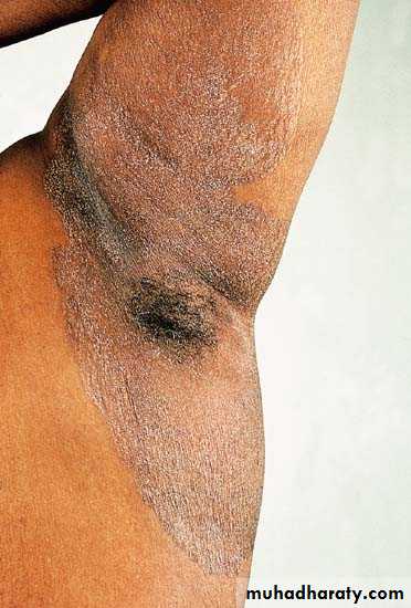 Caused by corynebacterium minutissimum a member of resident floraAsymptomatic, well demarcated, scaly, reddish brown