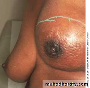 Treatment is by extended mastectomy with lymph node clearance.