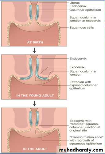During emberyogenesis junction upward migration of stratified squamous epithelium from urogenital sinus and vaginal plate to replace mullerian epithelium, this process usually end at sq. columnar junction, the location of SCJ vary with age, hormonal status, it evert outward during adolescent pregnancy and OCCP. It regress to endocervical canal in menapouse, prolong lactation, use of minipills.