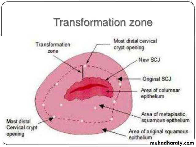 The rise in estrogen at puberty lead to glycogenation of non keratinized sq. epith. glycogen provide CHO sourse to lactobacilli(lacticacid lower PH), the exposure of columnar epith. to low PH lead to sq. metaplasia, this occure at SCJ forming a transformation zone TZ nearly all neoplasia occure at TZ (velnerable to oncogenic virus)