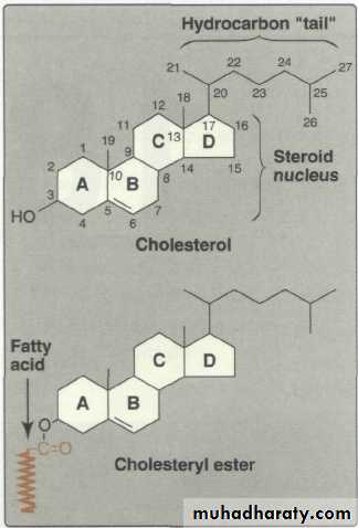 One of the main compound of the cell membrane. Precursor in the steroid hormones ,bile acids ,vitamin D synthesis .(The body can't break the steroid nucleus ,body can eliminate cholesterol either as unchanged or converted to bile acids ).Triglyceride