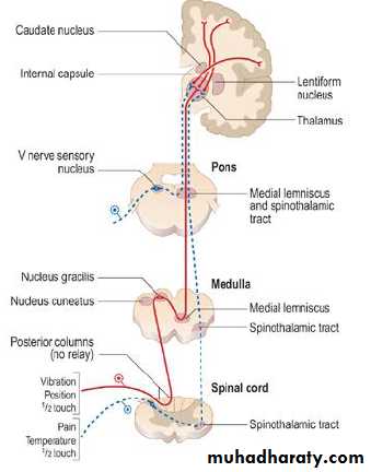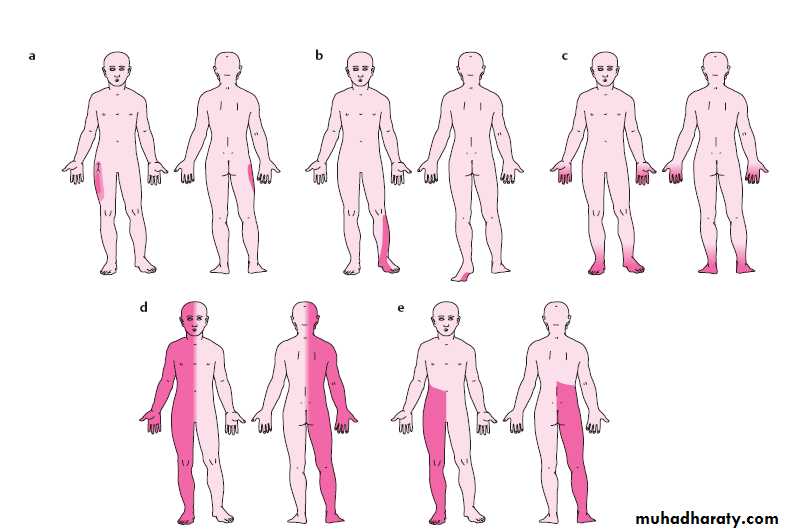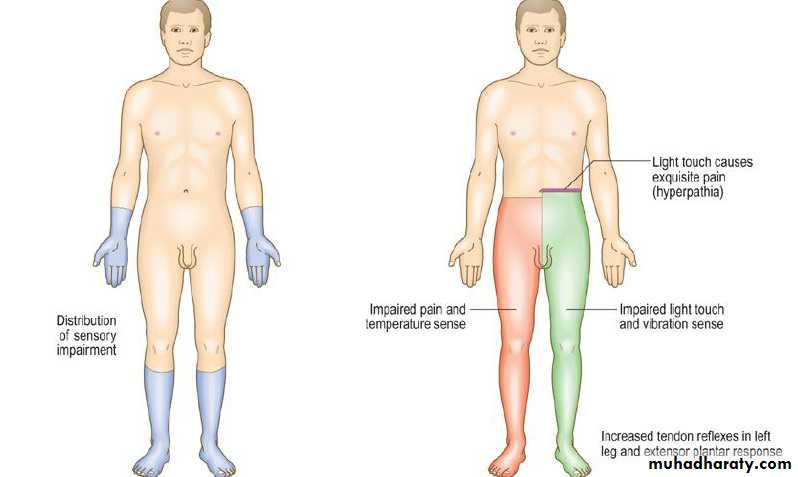 • 1-Hemianasthesia = thalamic lesion2-Glove-stock sensory impairment = peripheral neuropathy