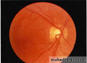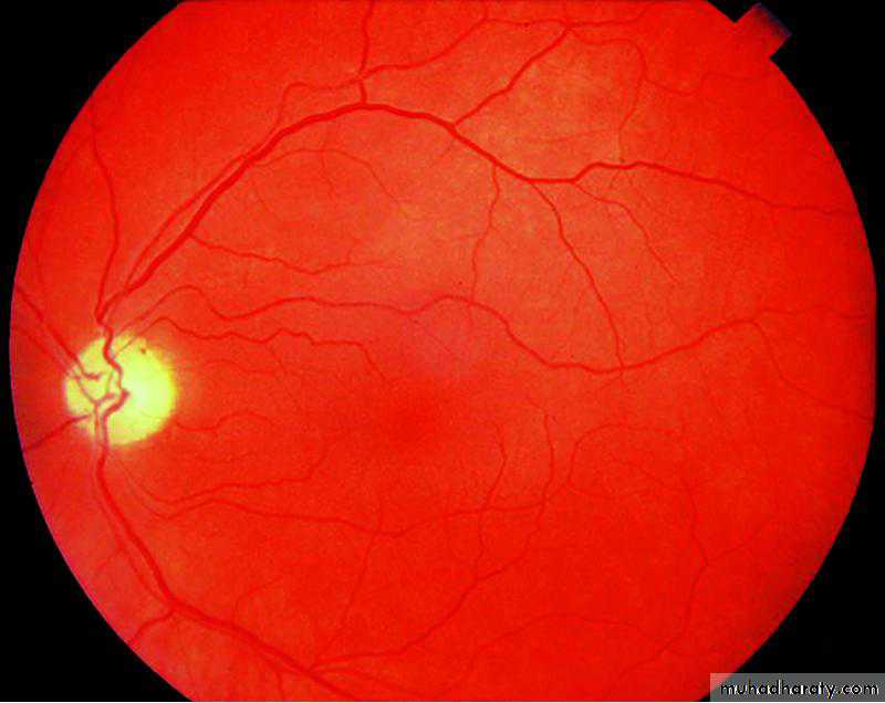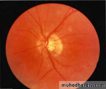Optic atrophyLoss of nerve fibres causes the optic disc to appear pale, as the choroid becomes visible.