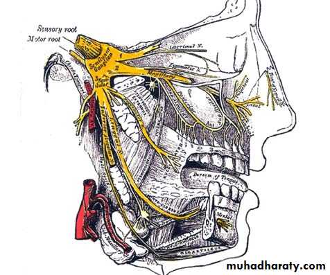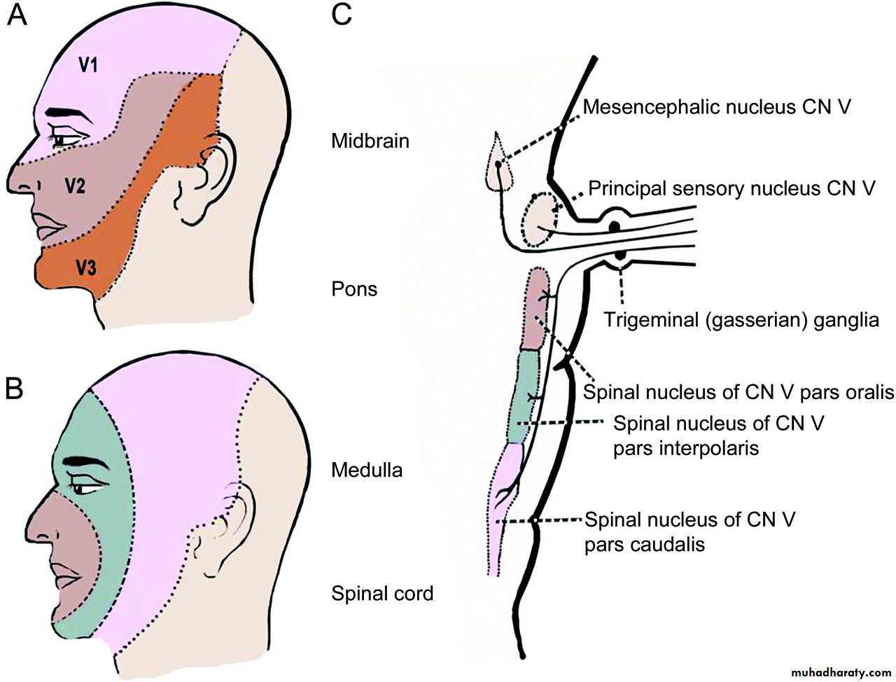 Lesions lead to loss of sensation in the face and weakness in muscles of masticationcauses: