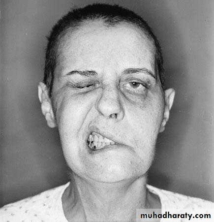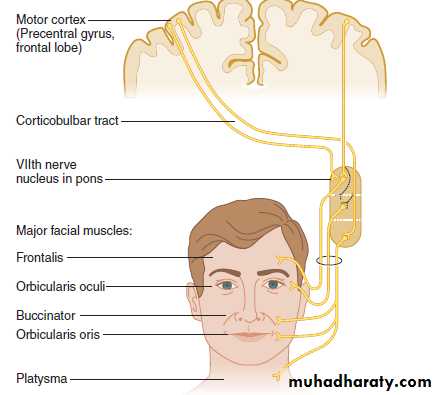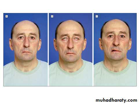 -In unilateral VII nerve upper motor neurone lesions, weakness (facial paresis) is marked in the lower facial muscles with relative sparing of the upper face. This is because there is bilateral cortical innervation of the upper facial muscles. While the nasolabial fold may be flattened and the corner of the mouth drooping, eye closure is usually well preserved.