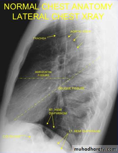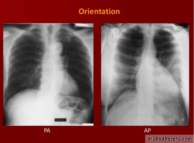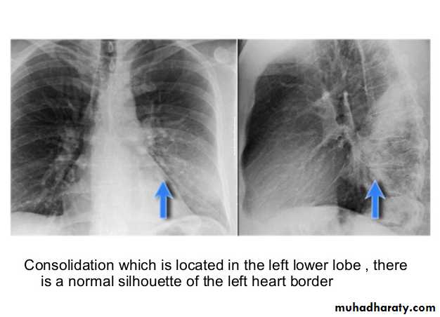 1- localize shadow by observing which border is obliterated, e.g.: loss of heart border means the shadow in ant. Half of the chest, loss of diaph. Outline indicate the dis. Of pl. or in lower lobes.