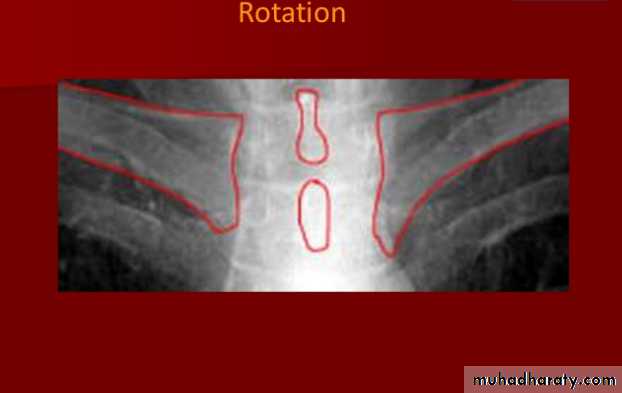 8- assess technical quality of the film: correctly exposed routine PA CXR is one in which the ribs and spine behind the heart can be identified but lung not overexposed.straight film is one where the medial ends of clavicles are equidistant from thoracic verteb.