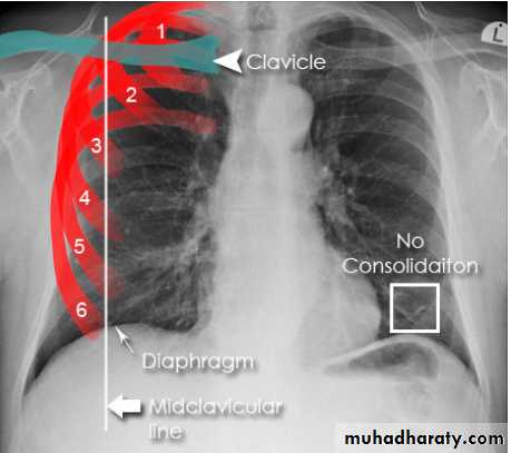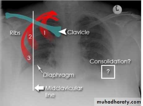 3- check position of heart and mediastinum: normally trachea lies midway or slightly to right of midpoint between medial end of clavicles.
