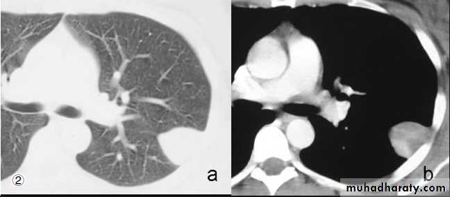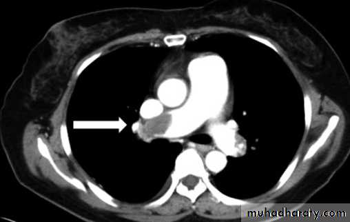 NECT with lt. pulm. A. thrombosis2- Showing shape of intrapulmonary or pleural opacity, detecting calc. or cavitation when plain CXR not conclusive.