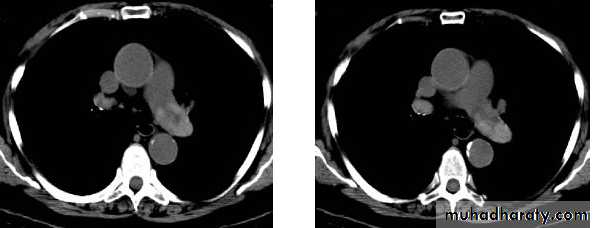 CT scan: IV CM part. Given when the purpose of examination is to visualize med., hila or pulm. Vessels.