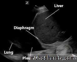 Ultrasound of chest: 1- confined to processes in contact with chest wall notably pl. effusion, pl. masses, selected med. Masses.