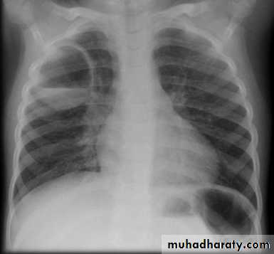 In young children the normal thymus is often clearly seen, with characteristic sail shape, projecting to rt. Side med.