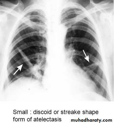 Linear(discoid)atelectasis : is not secondary to bronchial obst., but due to hypoventilation, commonest cause is postop. Or post traumatic pain. The result is horizontally oriented band or disc of collapse