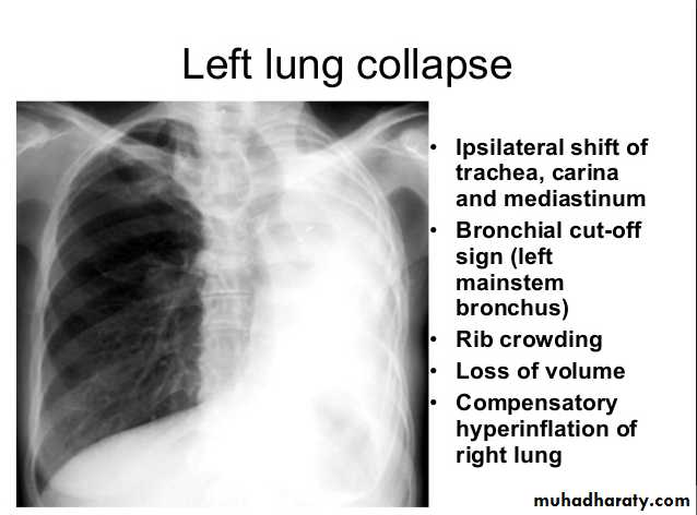 When lobe collapse, the unabsorbed lobe(s) on the side of collapse undergo compensatory expansion, the displaced fissure seen as well defined boundary to airless lobe, the med. And diaph. May move towards collapsed lobe.