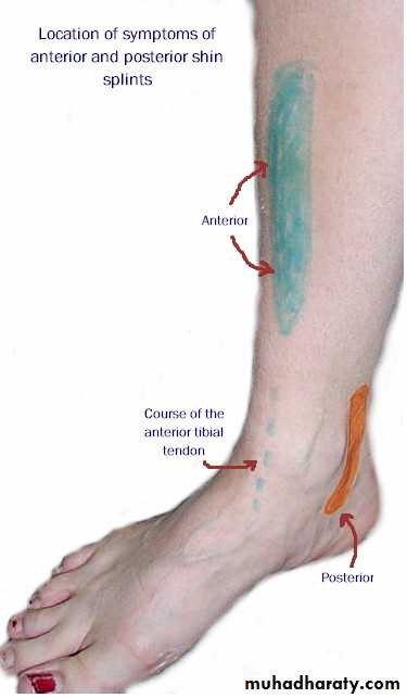 Severe pain in the front of the lower leg, aggravated by exercise and relieved by rest.Symptoms result from fascial compression of the muscles in the anterior tibial compartment and may be associated with foot drop.