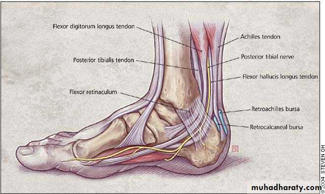 Posterior heel painTenderness and soft swelling posterior to tendon